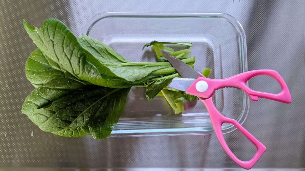 小松菜を水洗いして、4~5cm程度にカットする(包丁でももちろん良いですが、ハサミでもOK)