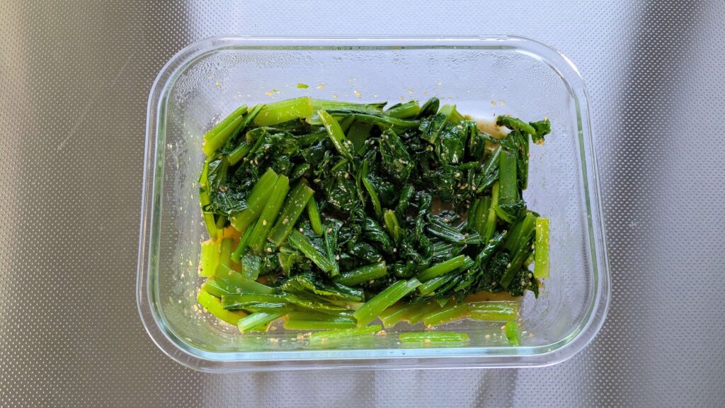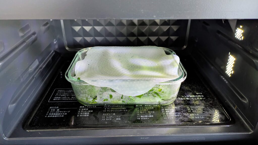 ふんわりラップをして、小松菜がしんなりするまで加熱してください。