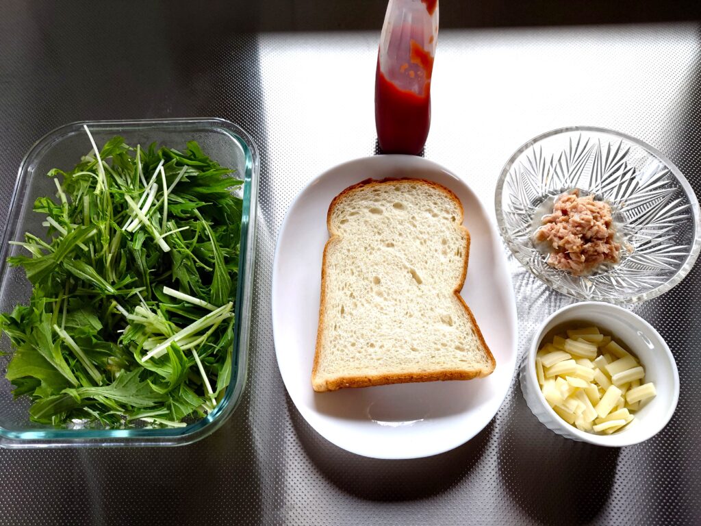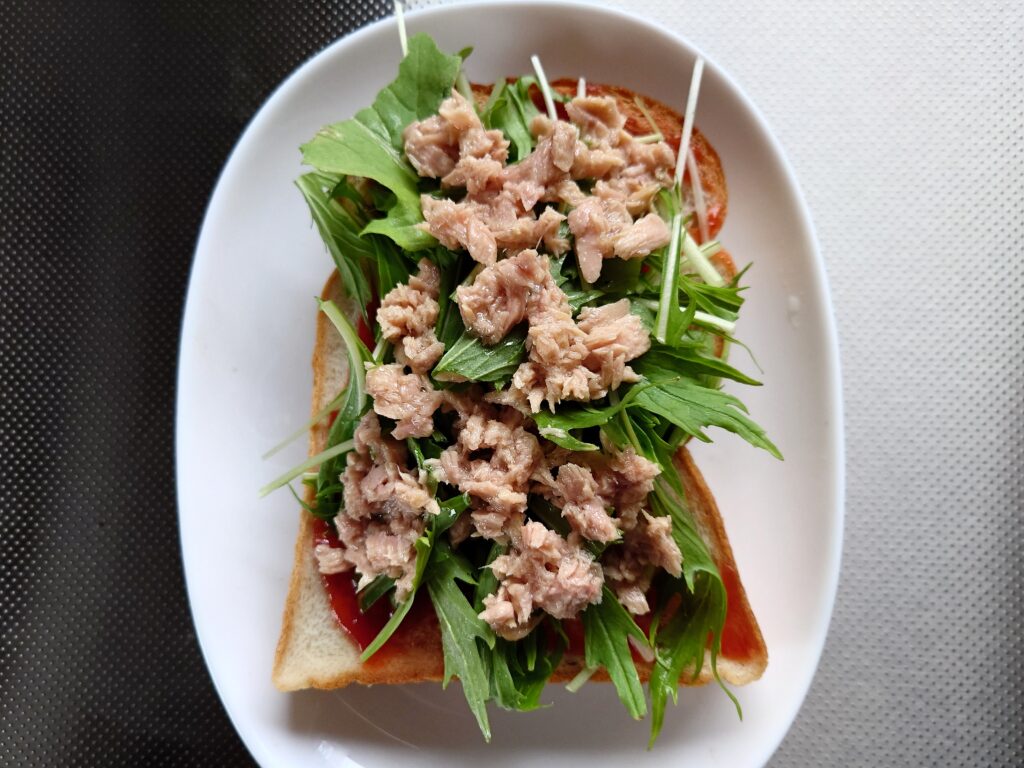 ケチャップの甘みとツナのジューシーさ、そして水菜がシャキシャキしておいしいですよ。