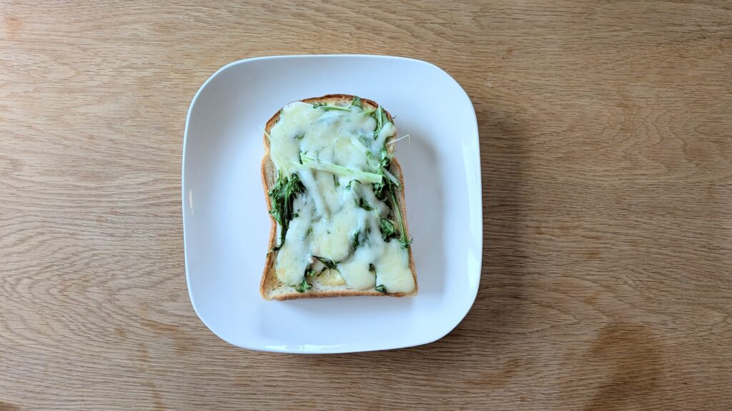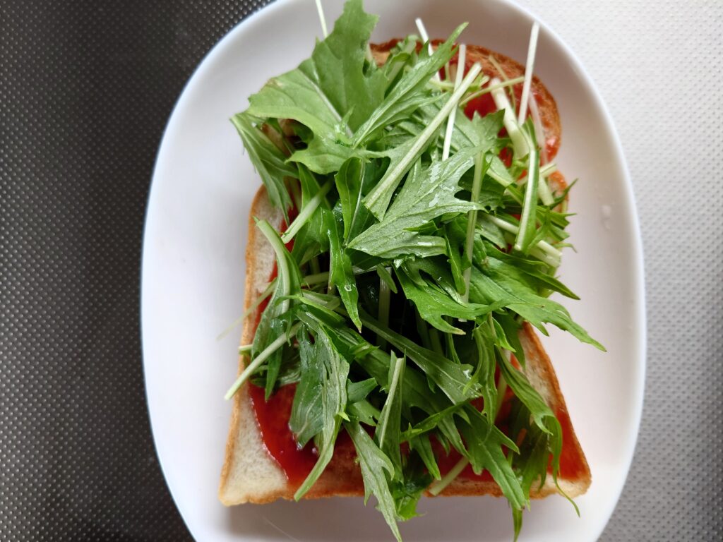 水菜は、トーストにするとかさがこんなにも減るので、朝から沢山サラダは食べられないなぁ〜という方でも、手軽に野菜を取り入れられます。