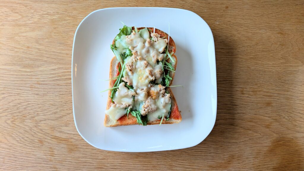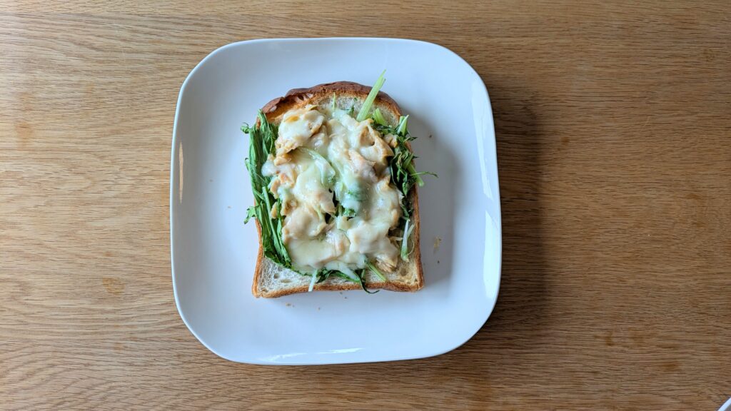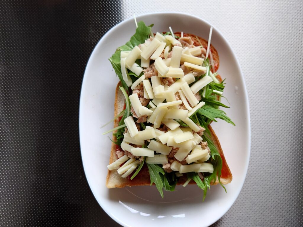トースト → 水菜 → 鮭フレークにマヨネーズをまぜたもの → チーズ の順にのせてトーストします