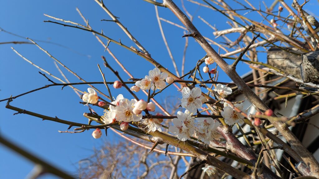 暖かい日も増え、去年は5輪も咲かなかった梅の花が、今年は少し多めに咲きました。
